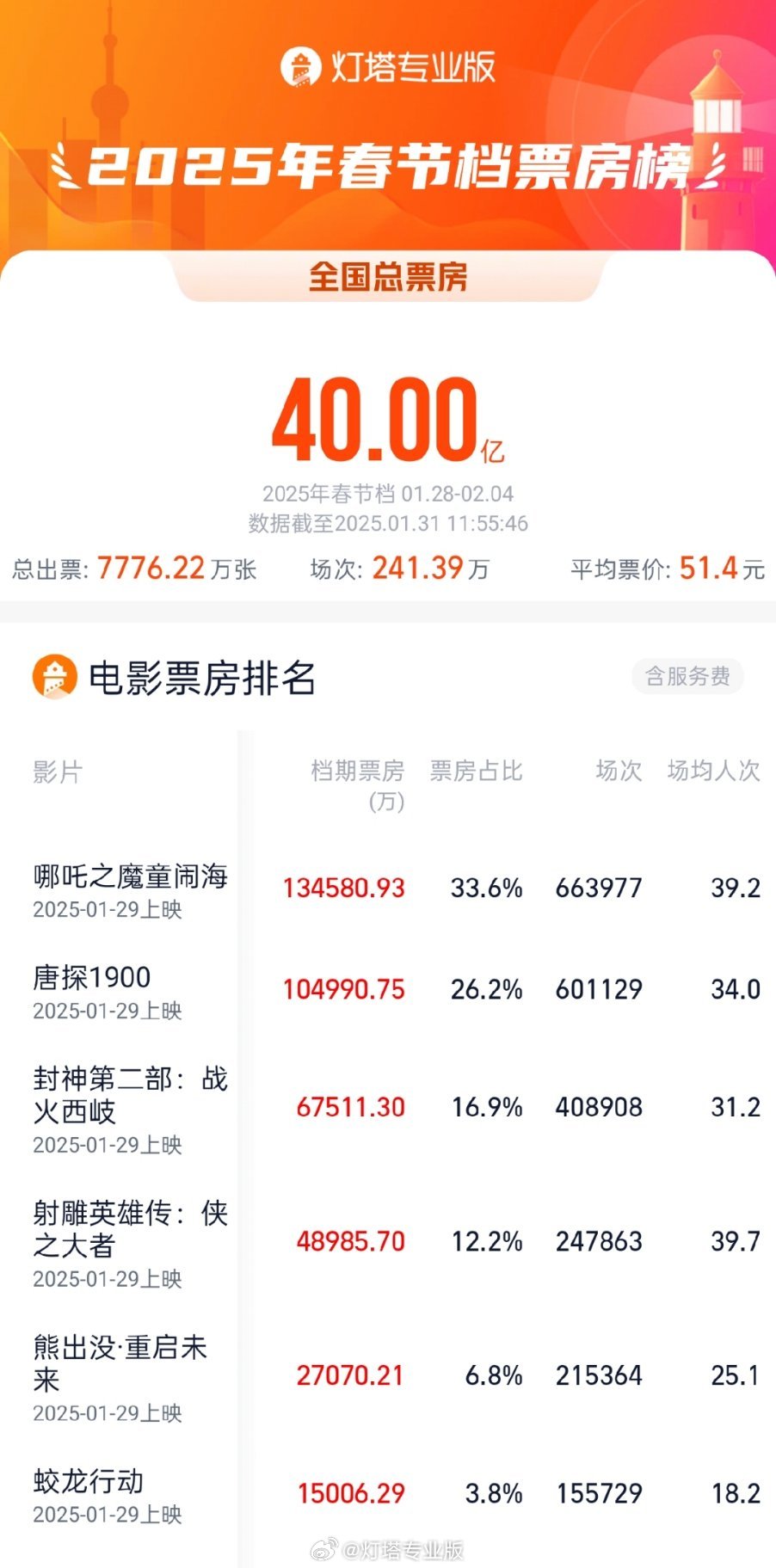 据灯塔专科版,兑现1月31日11时55分,2025年春节档(1月28日-2月4日)档期总票房(含预售)冲破40亿!