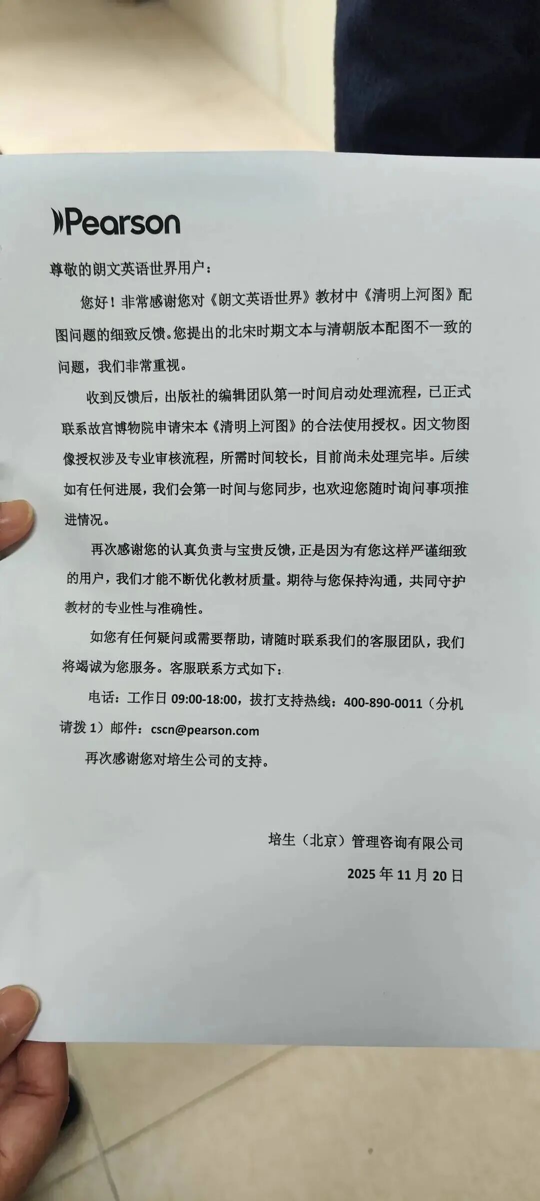 这位十岁的少年在预习《朗文英语寰宇》讲义发现:课文文告的是北宋时分的《晴朗上河图》,但所配插图却是清代版块,存在彰着史实不符问题。经家长反馈至四川省言语笔墨讲义处后,出书社速即回话,已运行向故宫博物院请求宋代原疆域像授权的经过。